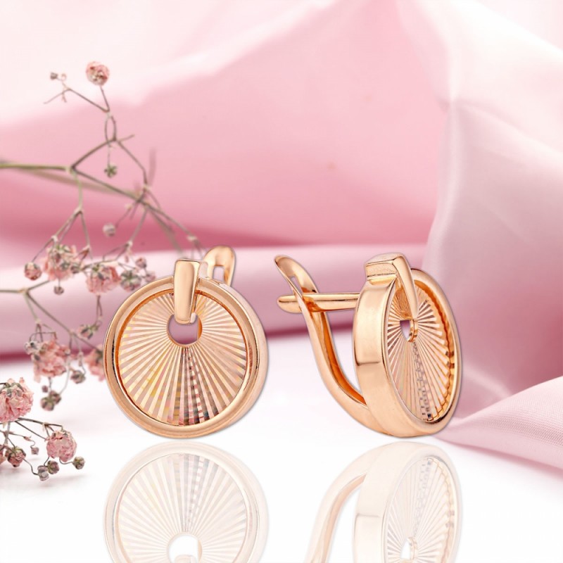 красного золота 585 пробы впечатляют своей четкой, но чрезвычайно элегантной формой. Круглая передняя часть украшена алмазной гравировкой, создающей красивый эффект солнечных лучей - тонкие линии света словно исходят из центра и заставляют поверхность мягко сверкать при каждом движении.