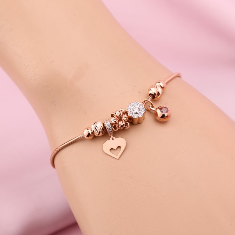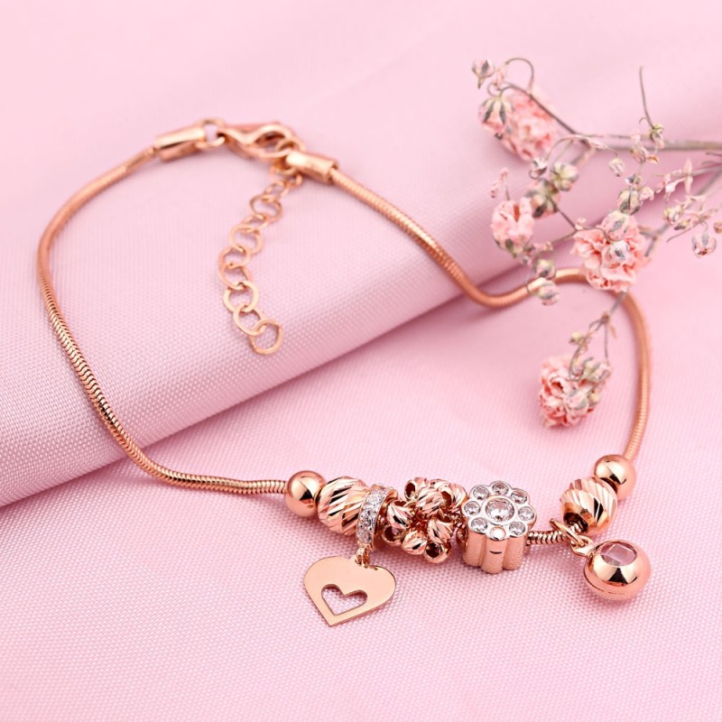 Изящный, женственный браслет из 14-каратного красного золота. На плетённой цепочке «Змея» очаровательные подвески со вставками из сверкающих цирконий и шариков ромбовидной огранки, придающих им оригинальный узор. Такой браслет прекрасно украсит элегантные женские руки! Прекрасный подарок близкому человеку!