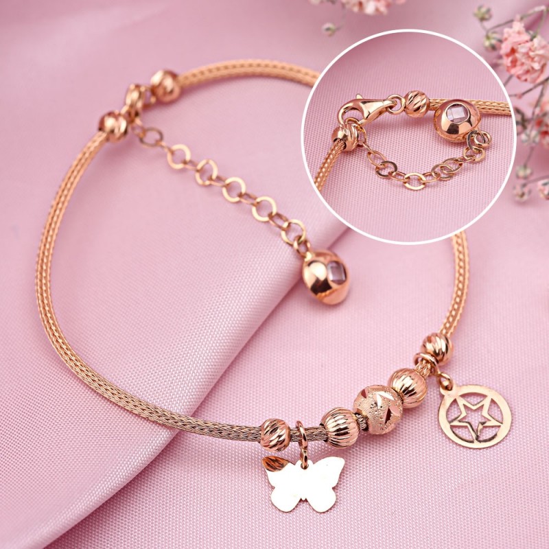 Элегантный, женственный браслет из 14-каратного красного золота в форме шнура с очаровательными подвесками. Благодаря алмазной огранке подвески получили оригинальный узор. Такой браслет прекрасно украсит изящные женские ручки! Прекрасный подарок близкому человеку!