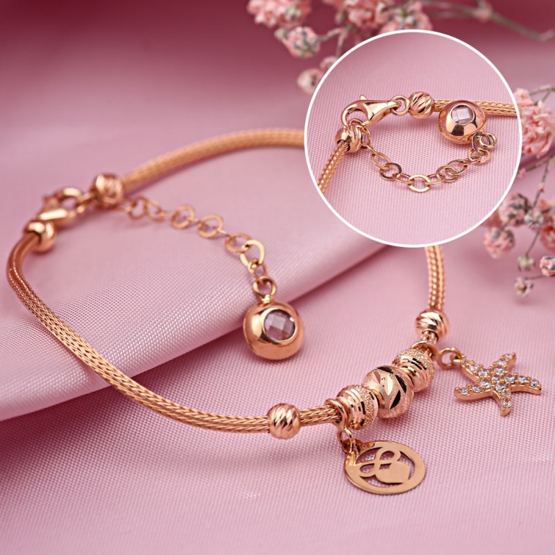 красного золота в форме шнура с очаровательными подвесками. Благодаря алмазной огранке подвески получили оригинальный узор. Такой браслет прекрасно украсит изящные женские руки! Прекрасный подарок близкому человеку!