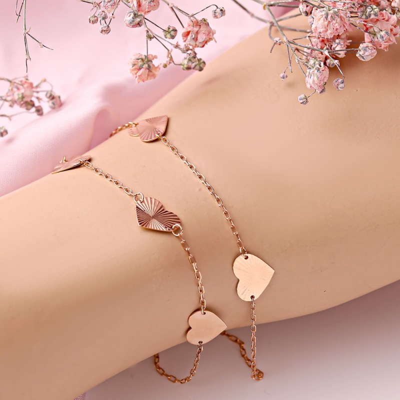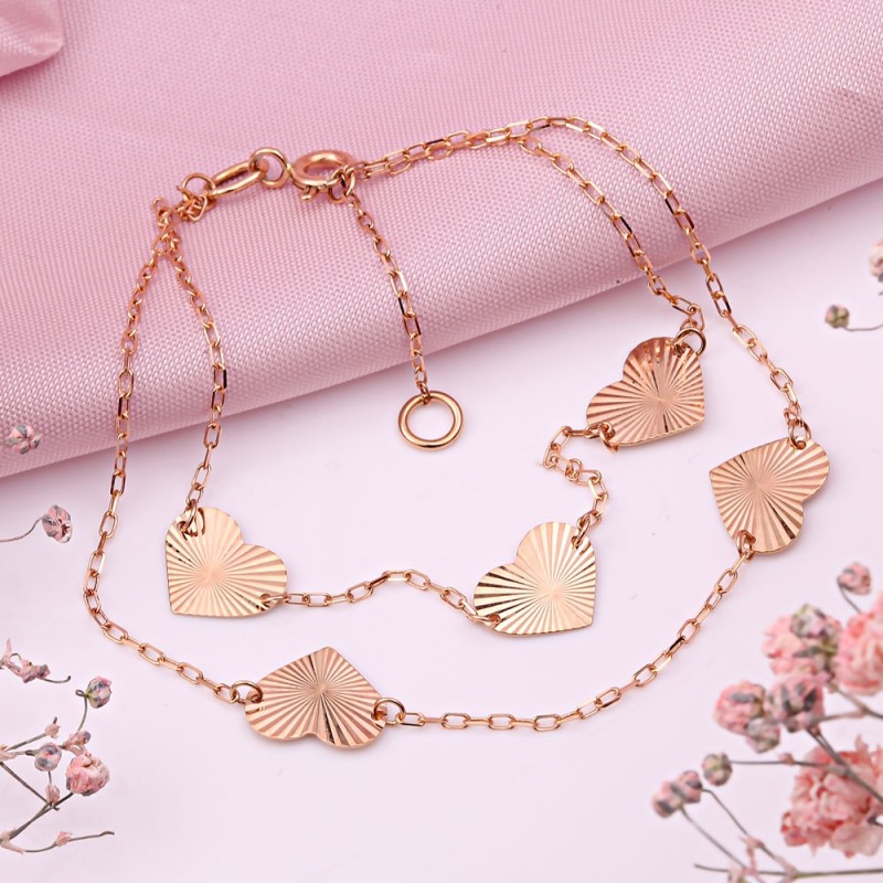 Очаровательный, исключительно красивый браслет из российского красного золота 585 пробы, украшенный зеркальными сердечками с одной стороны и бриллиантами с другой, на двойной цепочке из якорной оплетки. Красота, роскошь и ничего больше! Такой браслет прекрасно украсит руку и подчеркнет ее элегантность, дополняя образ и придавая ему шарм, женственность и изысканность!