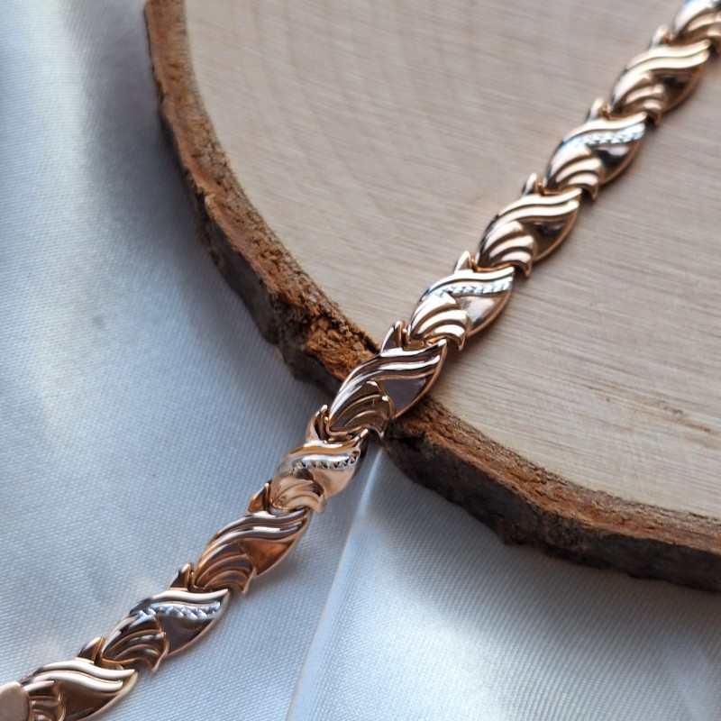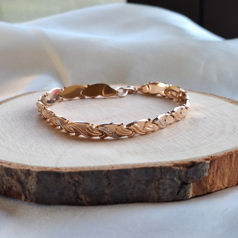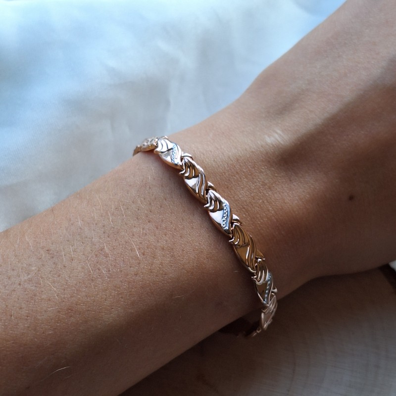 Золотой браслет Русское золото 585 Биколор Отличный браслет из классического красного золота 585 пробы с акцентами из белого золота с бриллиантовой огранкой. Фантазийное плетение. Прекрасное украшение для вашего запястья. Этот продукт подчеркивает изысканность и сильное чувство стиля!