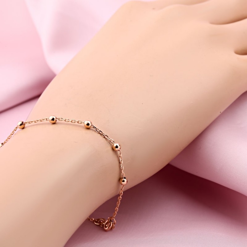 Золотой браслет Русское золото 585 пробы, Германия. Нежный и романтичный браслет из 14-каратного красного золота, украшенный золотыми декоративными бусинами. Цепочка - якорная коса с ромбовидной огранкой.