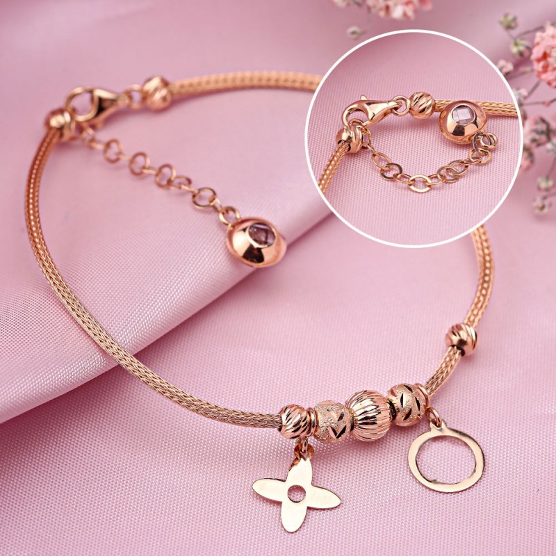 красного золота в форме шнура с очаровательными подвесками. Благодаря алмазной огранке подвески получили оригинальный узор. Такой браслет прекрасно украсит изящные женские руки! Прекрасный подарок близкому человеку!