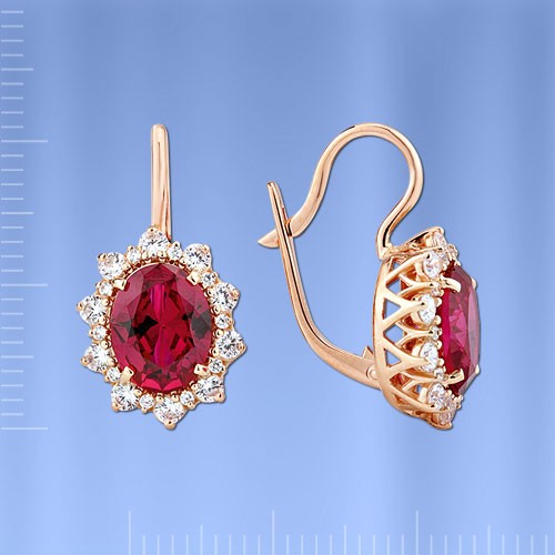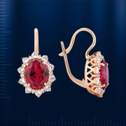Серьги из красного золота 585°, украшенные 2 корундовыми рубинами (10,0 х 8,0 мм) и фианитами. Эти ослепительные серьги поразят вас красотой и элегантностью