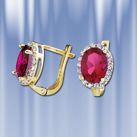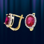 Серьги из желтого золота 585°, украшенные синтетическим рубином (8 х 6) мм и цирконами, которые являются идеальной имитацией бриллианта. Эти ослепительные серьги поразят вас красотой и элегантностью. Высота ок. 10 мм. С безопасным и надежным замком.