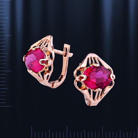 Серьги из русского красного золота 585°. Вставка: синтетический рубин (8 х 10 мм). Высота ок. 17 мм., ширина ок. 15 мм.