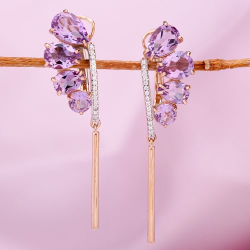 Серьги изготовлены из российского красного/белого золота 585° с 2 аметистами 9,0 х 6,0 мм, 2 аметистами 8,0 х 6,0 мм, 2 аметистами 7,0 х 5,0 мм, 2 аметистами ¢ 5,0 мм, 30 фианитами