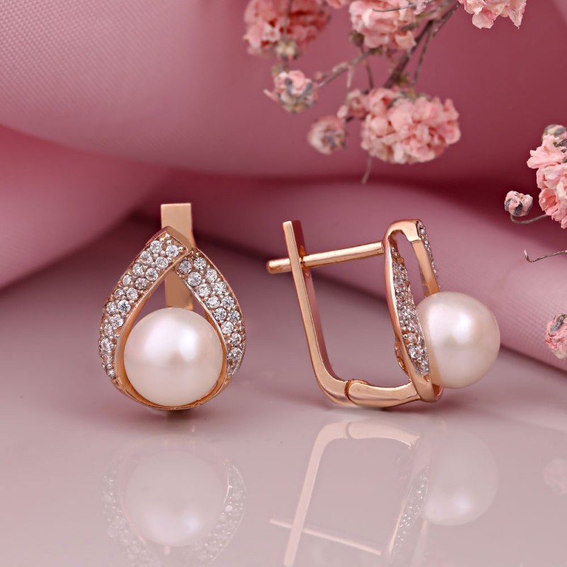 Очаровательные золотые серьги из красного и белого российского золота 585 пробы, украшенные натуральным культивированным белым жемчугом. Жемчуг окружен сверкающими фианитами! Эти серьги излучают шик и неотразимость! Украшения из жемчуга подчеркивают высокий социальный статус своих владельцев и выделяются на фоне других украшений.