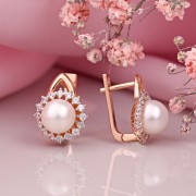 Очаровательные золотые серьги из красного и белого российского золота 585 пробы, украшенные натуральным культивированным белым жемчугом. Жемчуг окружен сверкающими фианитами! Эти серьги излучают шик и неотразимость! Украшения из жемчуга подчеркивают высокий социальный статус своих владельцев и выделяются на фоне других украшений.