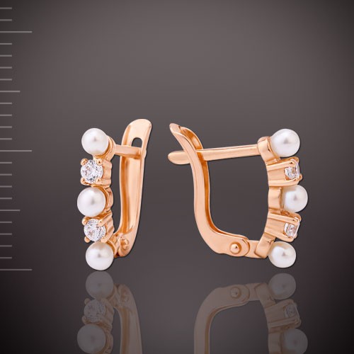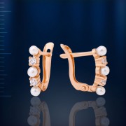 Серьги красно-белые 585°, украшенные 6 жемчужинами 2,0 мм, 4 фианитами ¢ 2,0 мм