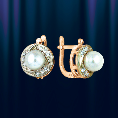 Серьги из русского золота 585°, украшенные жемчугом и бесцветными цирконами. Биколор