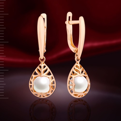 Серьги из красного золота 585 пробы, украшенные 2-мя жемчужинами ¢ 6,5 мм