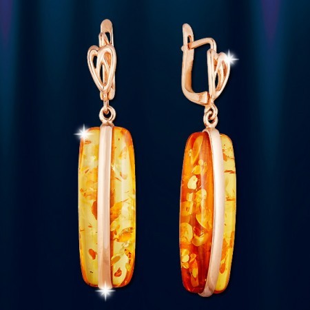 Серьги из русского красного золота 585 пробы с янтарем. Длина около 50 мм., ширина 12 мм.