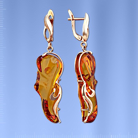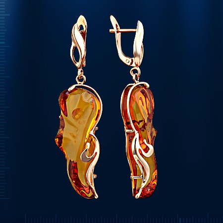 Красивые серьги из массива 585 (14кт) российского Красное золото с большим янтарем изящной закрепки (около 35 x 12 x 6 мм). Прямоугольный янтарь в теплых тонах гармонично привлекает внимание. Все серьги имеют размер примерно 55 x 15 мм, оснащены булавкой и складным рычагом, и их можно носить только с пирсингом. мочки ушей.