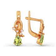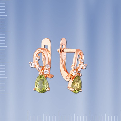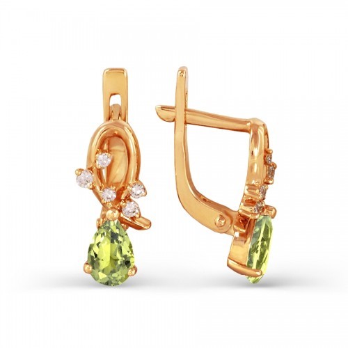 Серьги из красного золота 585°, украшенные хризолитом (6 х 4 мм) и 6 фианитами ¢ 1,25 мм., 4 фианитами ¢ 1,5 мм. Эти ослепительные серьги порадуют вас красотой и элегантностью. Высота ок. 15 мм., ширина ок. 5 мм.