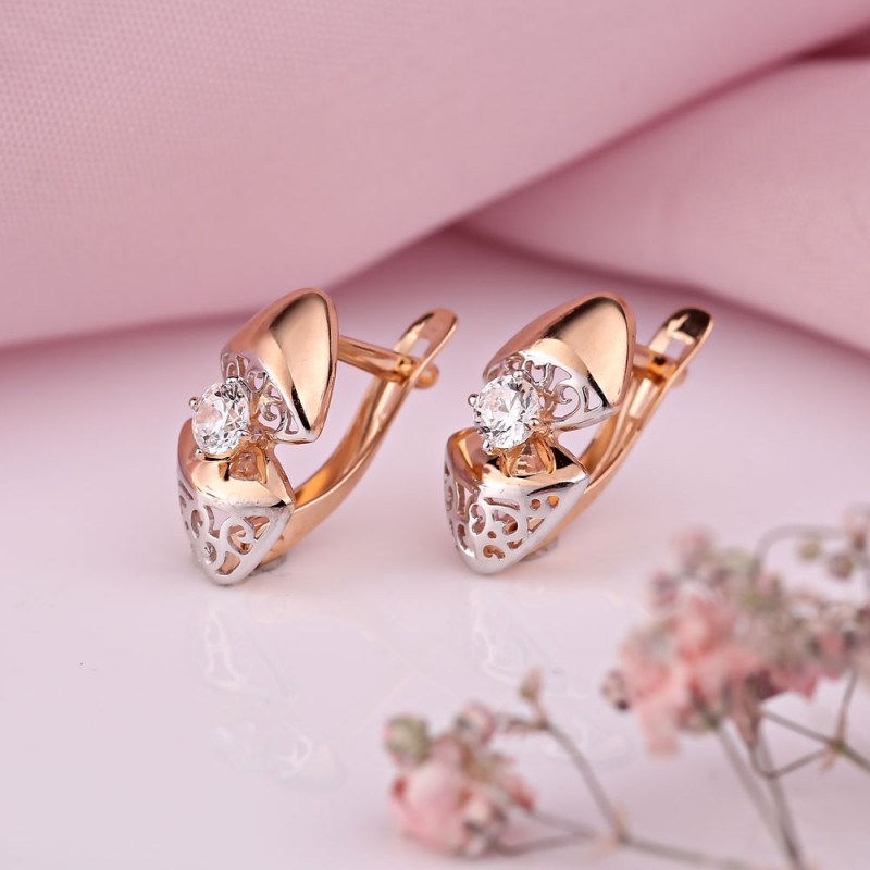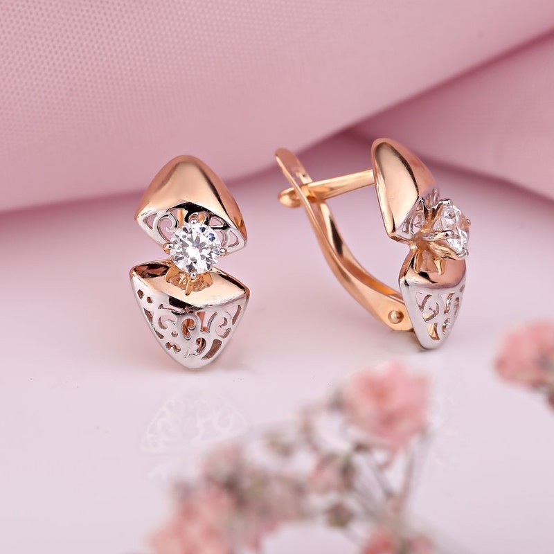 Красивые серьги из красного золота 585 пробы, украшенные сверкающими фианитами и филигранью. Родиевое покрытие!