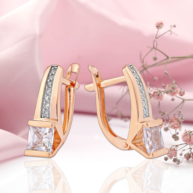 Золотые серьги из российского золота 585 пробы с цирконами. Женственные, элегантные серьги из красного золота 585 пробы, украшенные сверкающими циркониями на фоне из белого золота. Он подчеркнет вашу элегантность и женственность и привлечет восхищенные взгляды.