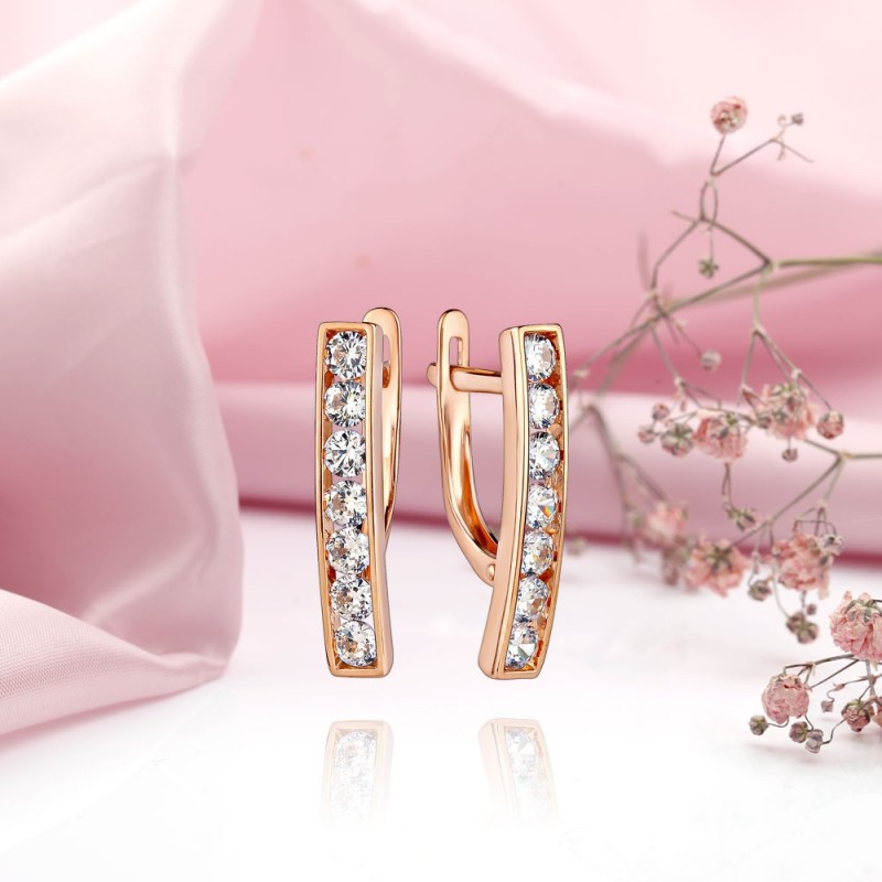 Очаровательные женственные серьги из 14-каратного красного золота со сверкающими цирконами! Золотые украшения сами по себе чрезвычайно гармоничны. Подходит к любому наряду!