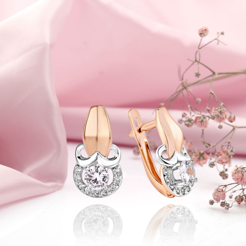 Красивые серьги из белого/розового золота 585 пробы, украшенные цирконием. Эти ослепительные серьги поразят вас красотой и элегантностью.