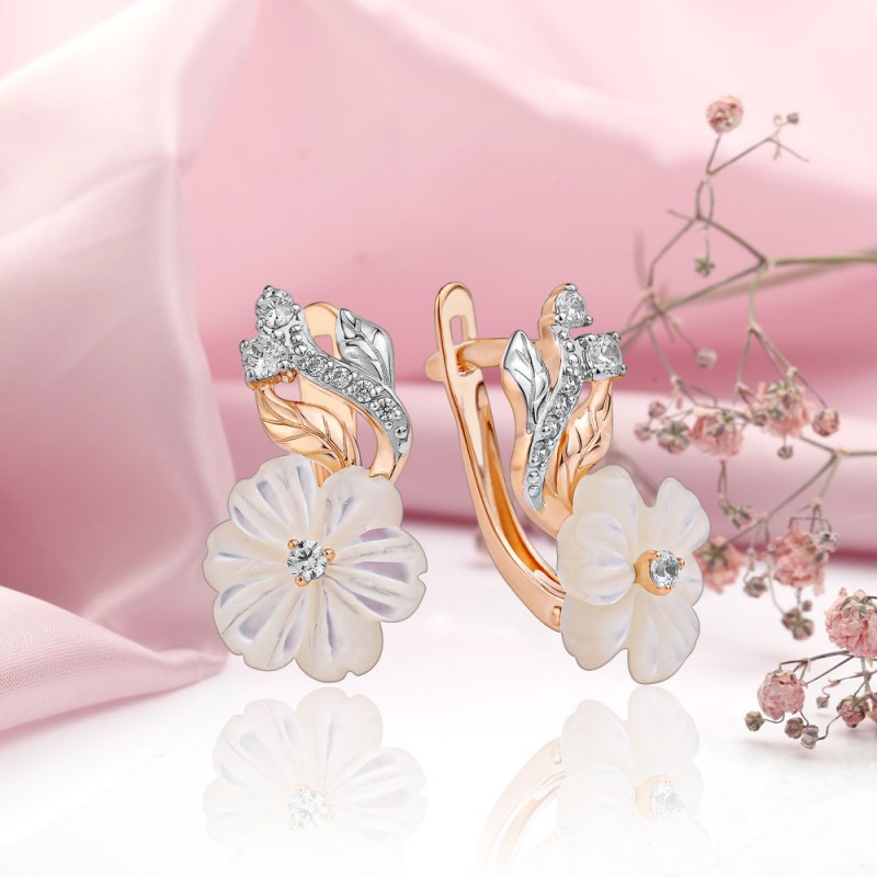 красного золота 585 пробы, украшенные очаровательными и сверкающими циркониями и перламутром.. Подчеркивают женственность, элегантность и хороший вкус. Очаровательный подарок для Ваших близких!