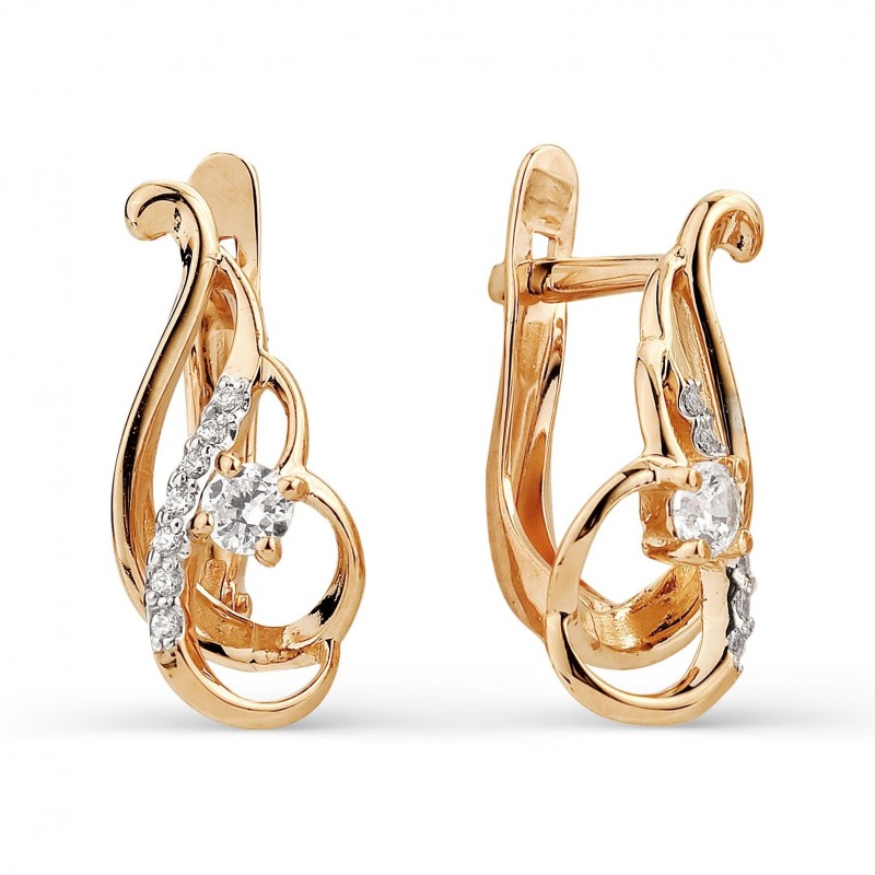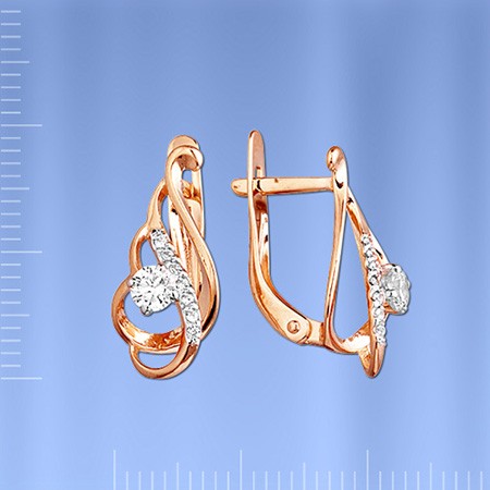 Серьги из русского красного золота 585° с 14 фианитами ¢ 1 мм., 2 фианитами ¢ 3,5 мм. Высота ок. 18 мм. Ширина около 8 мм.
