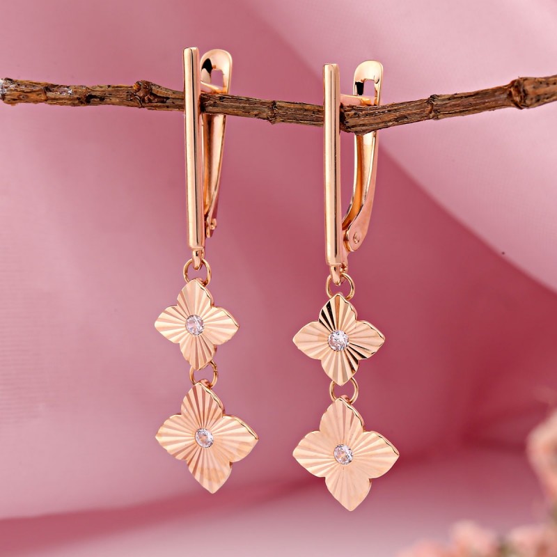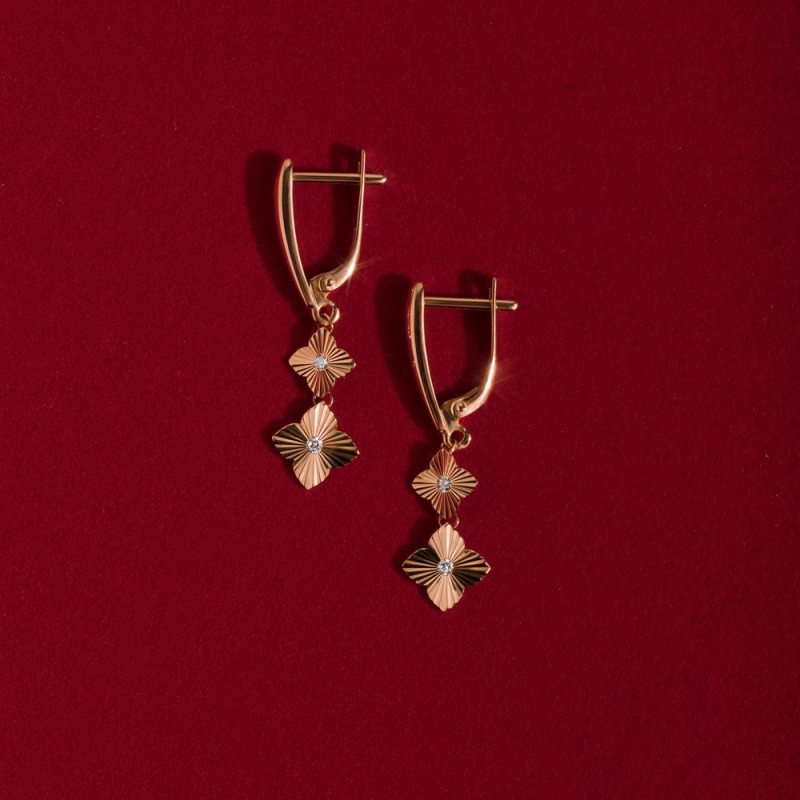 Купите подвесные серьги из золота 585. Эти серьги похожи на маленькие золотые цветочки, раскрывающиеся на свету. Мелкая лучевая структура придает поверхности яркое мерцание, а подвижная двойная композиция создает нежную, плавную динамику.