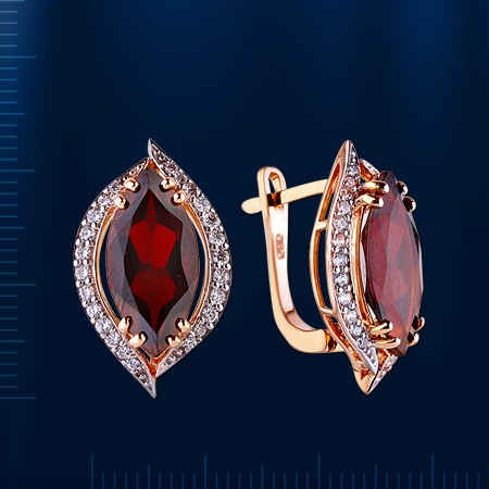 Серьги из красного/белого золота 585°, украшенные 2 гранатами (16,0 х 8,0 мм) и фианитами ¢ 1,0 мм. Эти ослепительные серьги порадуют вас красотой и элегантностью.