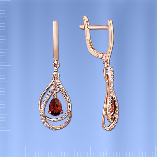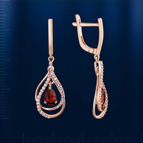 Серьги из красного золота 585°, украшенные 2 гранатами (6,0 х 4,0 мм 0,196 карат), 78 фианитами ¢ 1,0 мм 0,156, 8 фианитами ¢ 0,8 мм 0,008