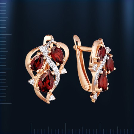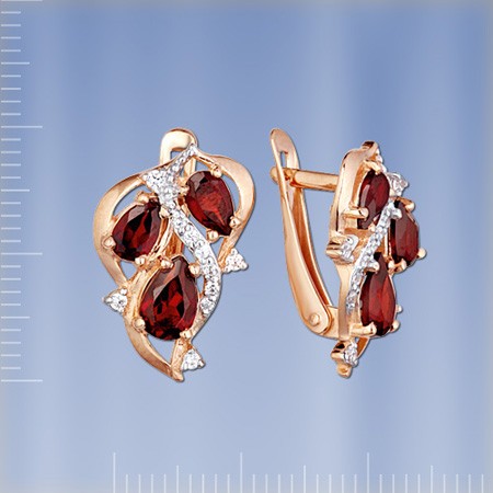 Серьги из красного/белого золота 585°, украшенные 2 гранатами (6 х 4 мм 0,231 карат), 4 гранатами (5 х 3 мм 0,200 карат) и 20 фианитами ¢ 1 мм. Эти ослепительные серьги порадуют вас красотой и элегантностью.