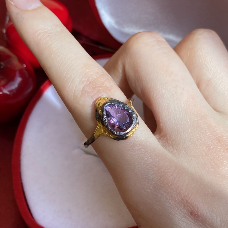 аметистом. Благодаря умело расставленным акцентам с помощью позолоты кольцо выглядит неповторимо красиво. Отличное дополнение вашего образа женственности и романтики.