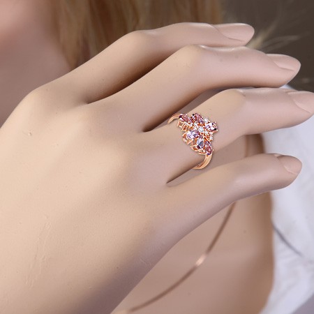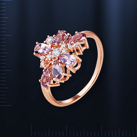 Кольцо выполнено из красного русского золота 585° с аметистами. 12 аметистов (6 х 3 мм), 7 фианитов Ø1 мм, 2 фианита Ø1 мм. Высота ок. 14 мм.