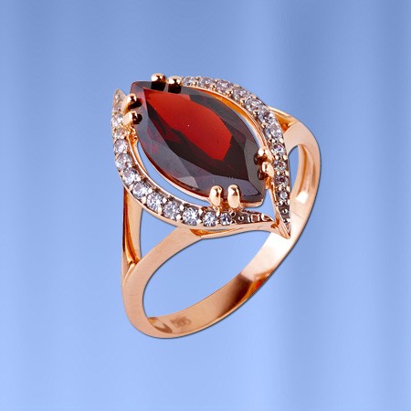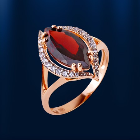 Кольцо выполнено из российского красного/белого золота 585° с Гранатом 16,0 х 8,0 мм, Фианиты ¢ 1,0 мм. Высота ок. 22,0 мм