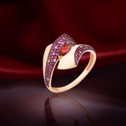 Кольцо выполнено из русского красного золота 585° с гранатом 6,0 х 3,0 мм, 52 фианита ¢ 1,0 мм красного, 13 фианитов ¢ 1,0 мм розового, 14 фианитов ¢ 1,0 мм граната