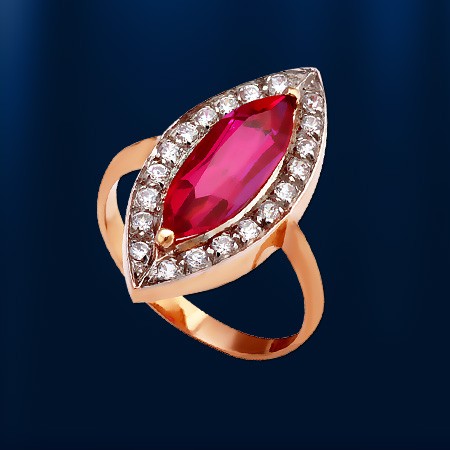 Кольцо изготовлено из русского красного золота 585° с корундом (18,0 х 6,0 мм.), Фианиты ¢ 2 мм. Высота ок. 27 мм