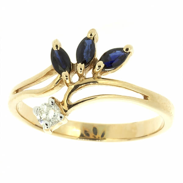 Золотое кольцо из красного золота с сапфирами и бриллиантом.