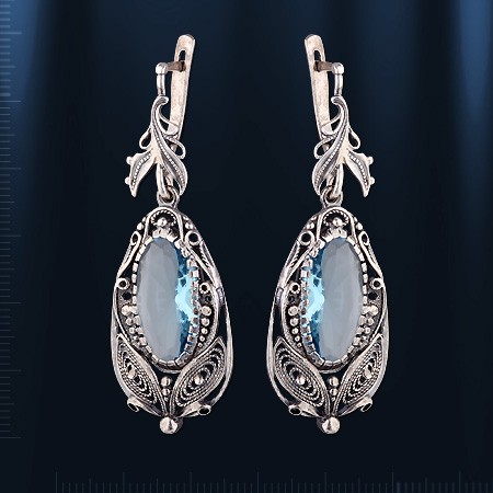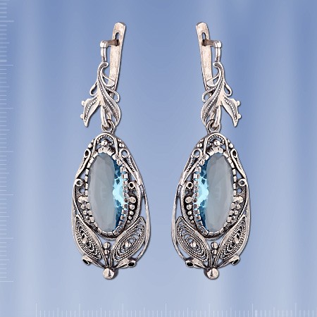 Серьги с синтетическим топазом (10 х 20 мм). Высота около 60 мм, ширина около 22 мм. Серебро 925°