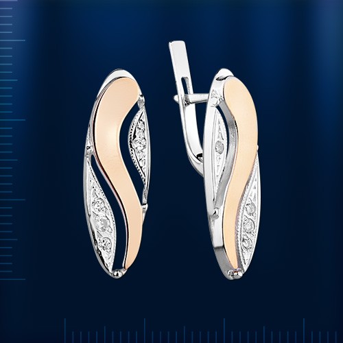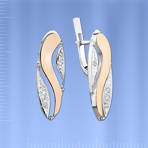 Серьги из серебра 925° и золота 375° с фианитами ¢ 1,0 мм. Высота ок. 28,0 мм., ширина ок. 8,0 мм.