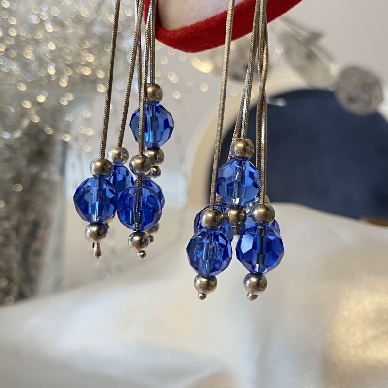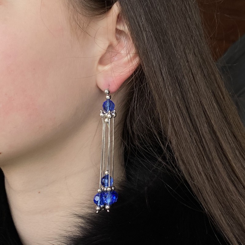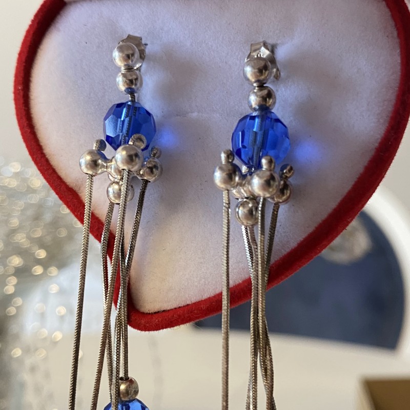 Шикарные, модные серьги в виде пуссет. Серебро 925 пробы! На серебряных цепочках из «змеиной» тесьмы воздушно висят серебряные шарики и синие цирконии. Отличный подарок или возможность побаловать себя.