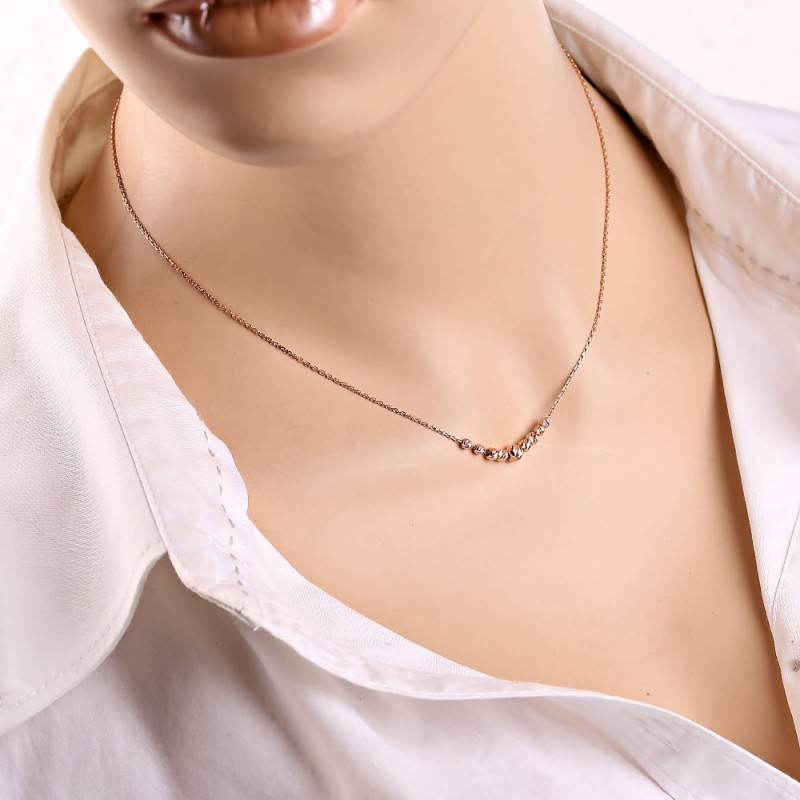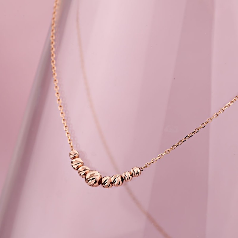 Золотое колье Русское золото 585 пробы, Германия. Нежное и романтичное золотое колье из 14-каратного красного золота, украшенное золотыми декоративными бусинами бриллиантовой огранки. Цепочка - якорная коса с ромбовидной огранкой. Если вы хотите подчеркнуть в своей спутнице ее женственность, грацию, улыбку и красоту, то такой подарок как раз для вас.