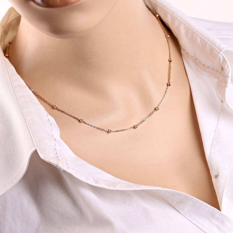 красного золота, украшенное золотыми декоративными бусинами бриллиантовой огранки. Цепочка - якорная коса с ромбовидной огранкой. Если вы хотите подчеркнуть в своей спутнице ее женственность, грацию, улыбку и красоту, то такой подарок как раз для вас.