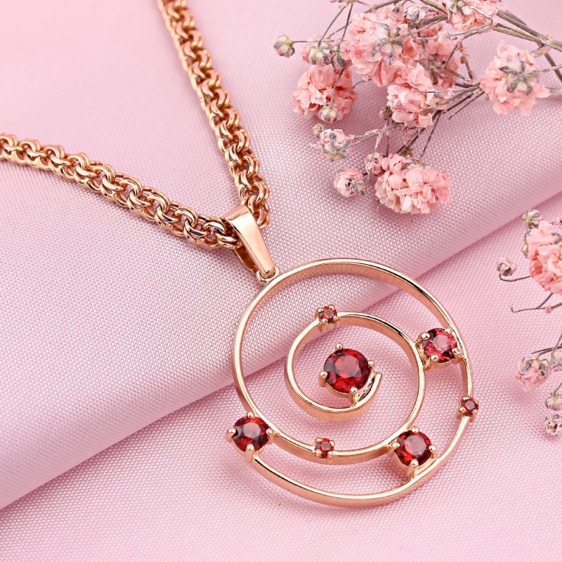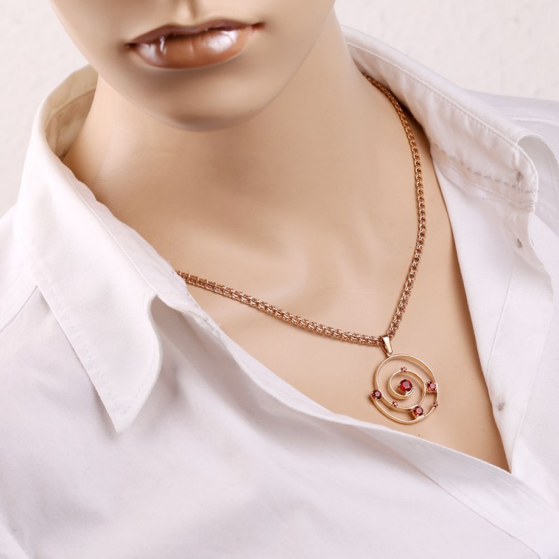 красного золота 585 пробы, украшенное кулоном со вставкой из граната. Цепочка представляет собой изящную косу Бисмарка с ромбовидной огранкой.