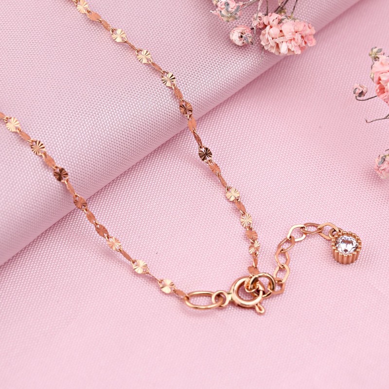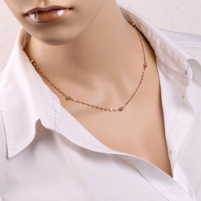 Элегантное и женственное колье из 14-каратного розового золота, выполненное из причудливой якорной тесьмы с ромбовидной огранкой и вставки из золотых шариков! Оригинальная обработка звеньев цепи создает впечатление, будто цепь украшена драгоценными камнями. Изделие выглядит богато и привлекает восторженные взгляды окружающих тем, что переливается и сверкает на солнце.