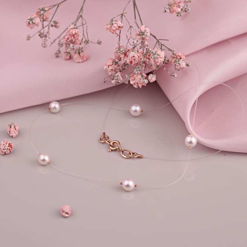 Нежное колье из невидимой нейлоновой цепочки, с синтетическим жемчугом в качестве кулона, с застежкой и вставкой из красного золота 585 пробы. Украшения из жемчуга подчеркивают высокий социальный статус своих владельцев и выделяются на фоне других украшений.