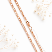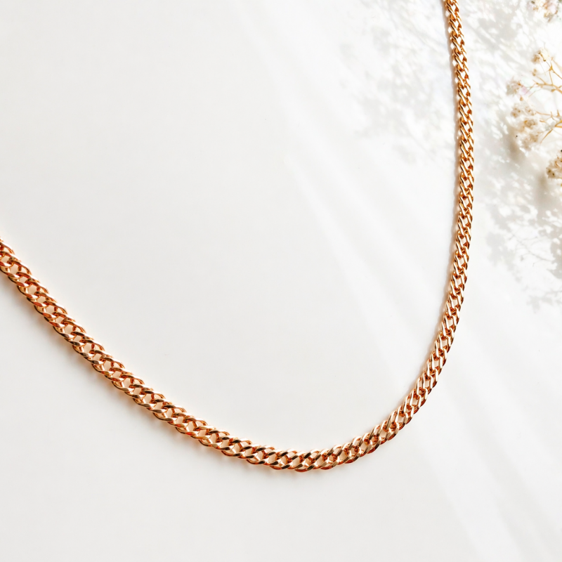 Красное золото 585 пробы символизирует долговечность и теплый, элегантный цвет. Гладкая полировка подчеркивает структуру двойной оплетки и придает цепочке четкий и качественный вид.