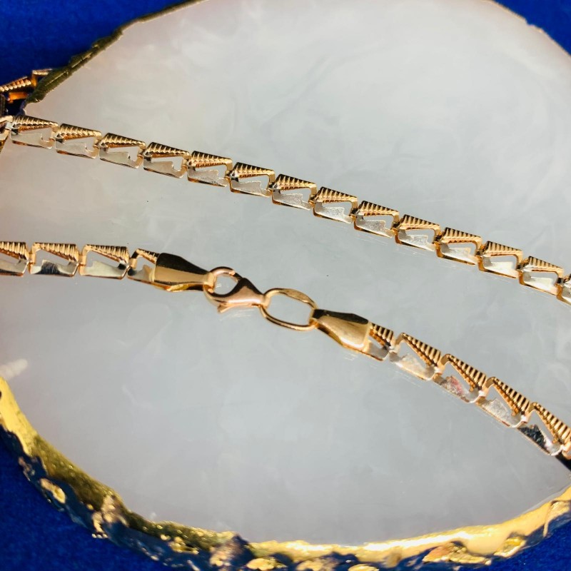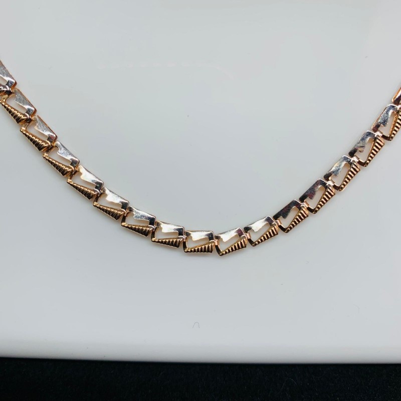 Цепочка из российского золота 585 пробы, Германия. Плоская золотая цепочка 585 пробы из 14-каратного красного золота в сочетании с белым золотом со сверкающим бриллиантом. Двухслойное плетение ламелей подходит как женщинам, так и мужчинам. Ожерелья и браслеты из золота добавляют образу необходимый акцент и привлекают внимание к богатству и роскоши аксессуаров, ведь золото – это красиво, стильно, шикарно и дорого.