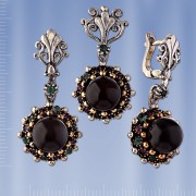 Комплект из черненого серебра 925° с агатом Ø 10 мм, рубином Ø 1 мм и изумрудом Ø 1 мм. Комплект состоит из кулона и сережек с английским замком. Высота кулона около 32 мм. Ширина ок. 18 мм. Высота серег около 40 мм, ширина около 18 мм.