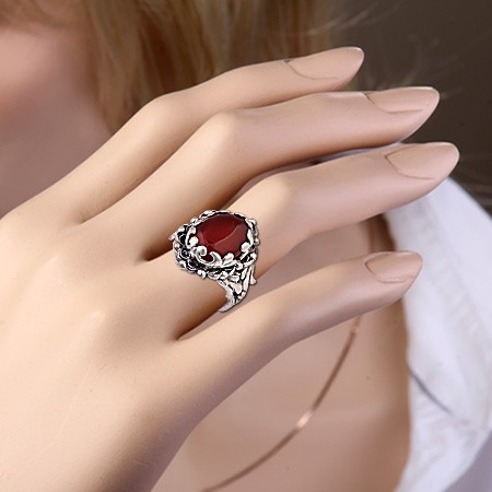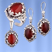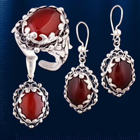 Комплект из черненого серебра 925° с агатом (12 х 17 мм). Комплект состоит из кулона, кольца и серег с французским замком.