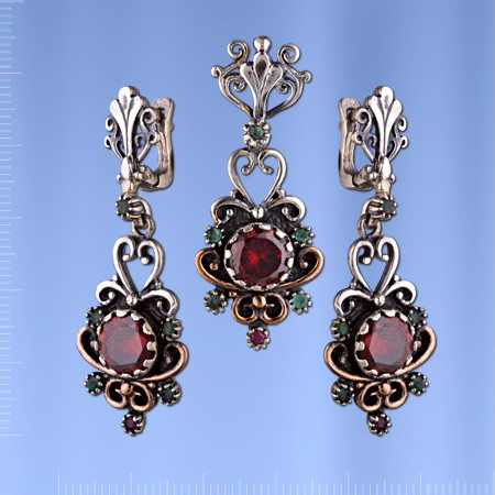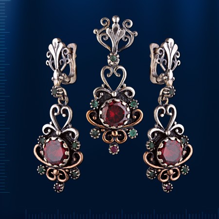 Набор из черненого серебра 925° с ГранатГранат ¢ 8 мм, Изумруды ¢ 2 мм, Рубины ¢ 2 мм. Набор состоит из трейлера и Серьги
