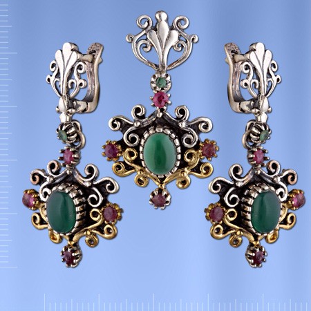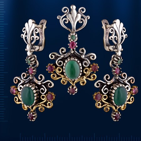 Серебряный комплект с изумрудами и рубинами